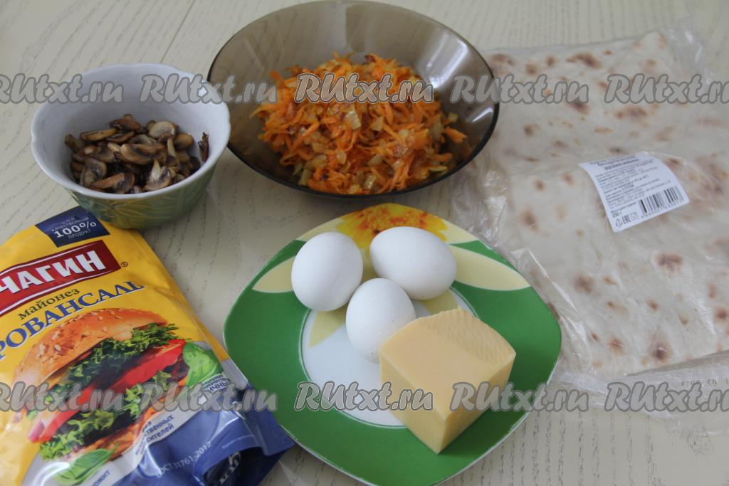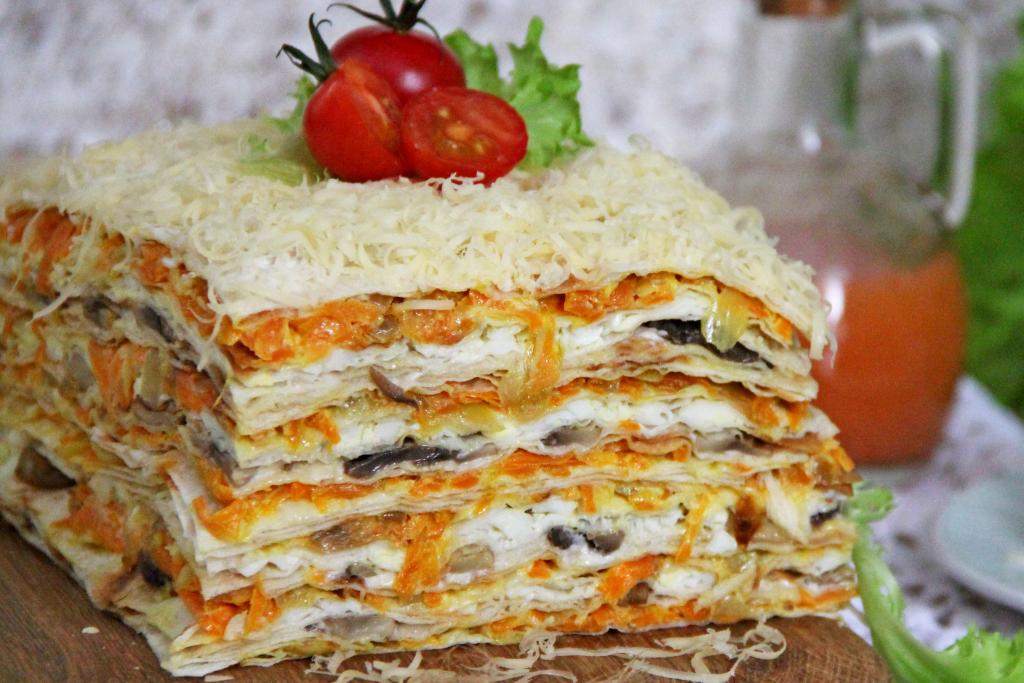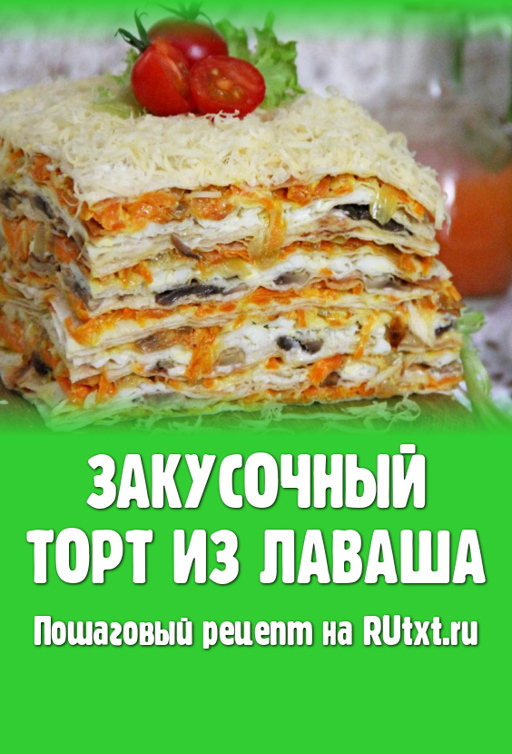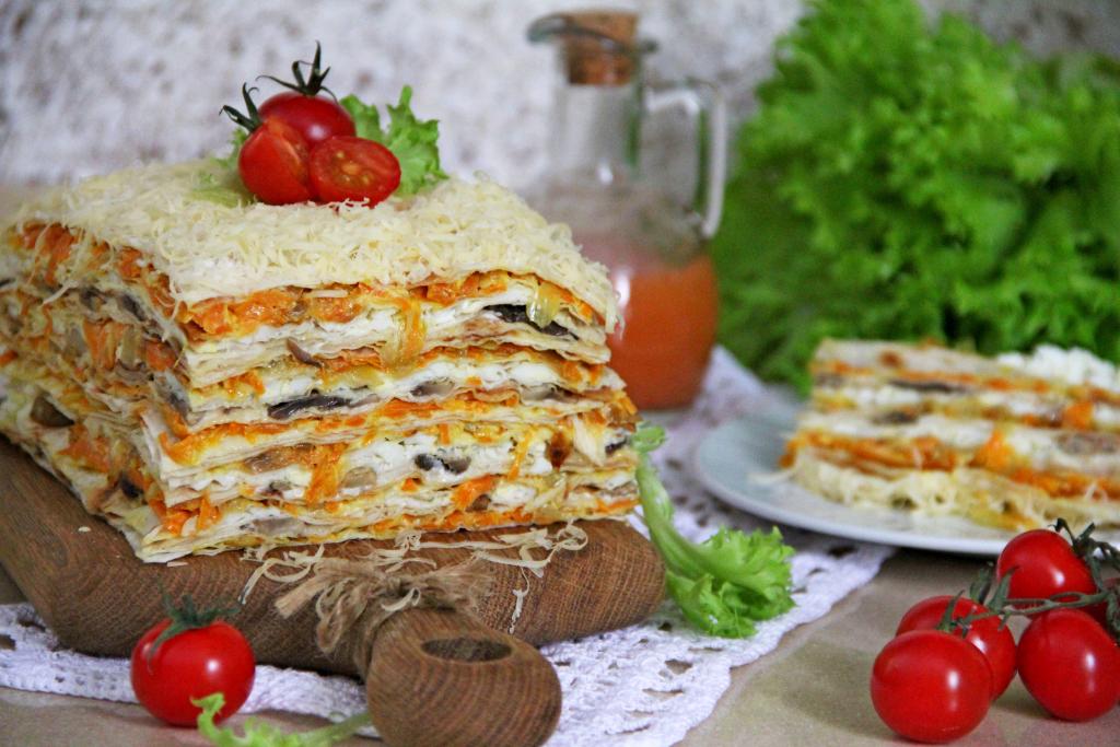 На праздничный стол в качестве холодной закуски можно приготовить закусочный торт из лаваша. Начинкой для этого тортика станут жареные шампиньоны, морковка с луком, твёрдый сыр и варёные яйца. Торт получается очень вкусным, сытным, нежным и красивым. Ему обязательно нужно дать время пропитаться, так что готовьте его заранее. Уверена, такая закуска внесёт приятное разнообразие в праздничное меню!