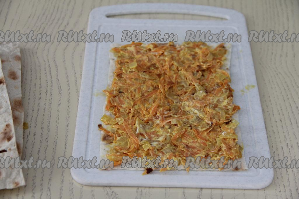 Выложить на доску первый лист лаваша, равномерно выложить на него половину овощной начинки.