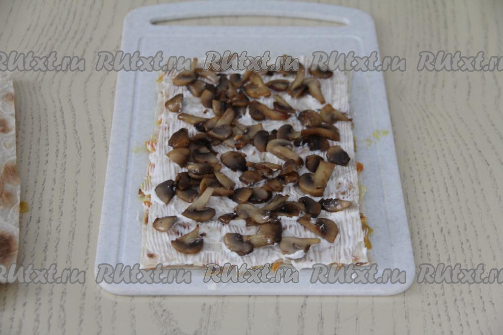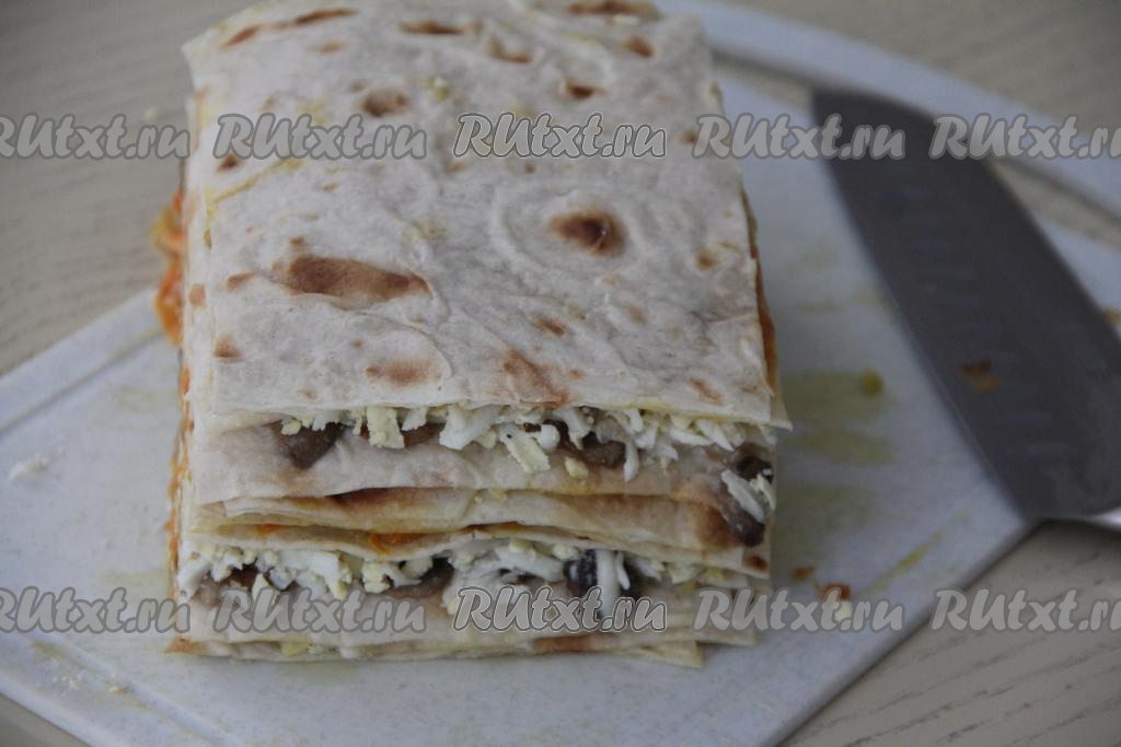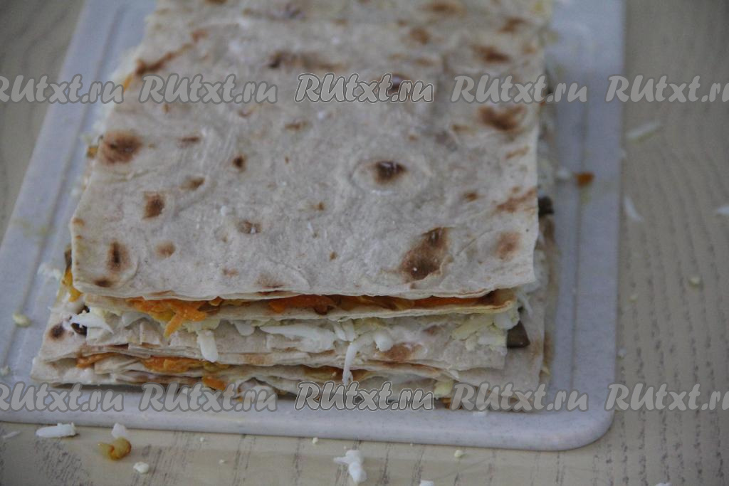 Продолжать собирать закусочный торт, для этого выложить четвёртый лист лаваша, смазать оставшейся овощной начинкой, разместить пятый лист лаваша, смазать майонезом, разложить оставшиеся грибы. Выложить шестой лист лаваша.