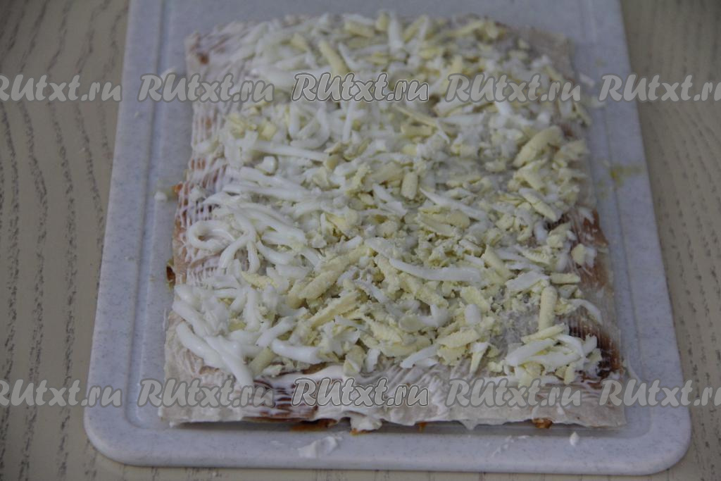 Накрыть третьим листом лаваша, смазать майонезом. Яйца натереть на крупной тёрке. Равномерно выложить половину натёртых яиц на лаваш.