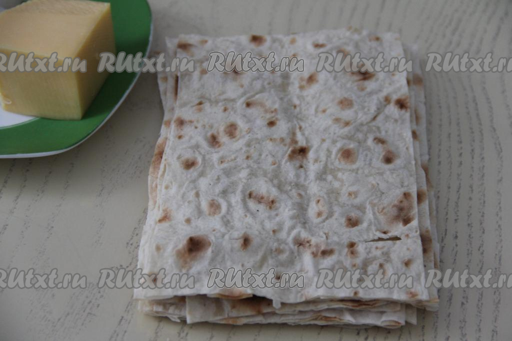 Нарезать лаваш на равные части (я разрезала 2 лаваша на 6 одинаковых листов).