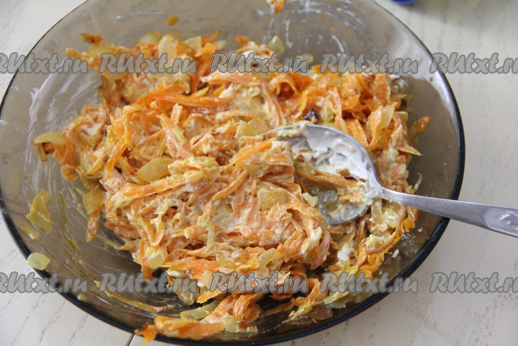 Очищенные зубчики чеснока пропустить через пресс и вместе с 1-2 столовыми ложками майонеза добавить к остывшим жареным моркови и луку.