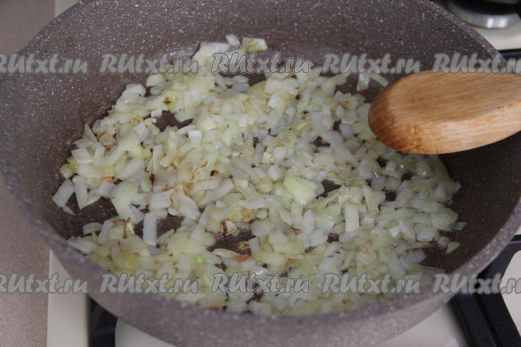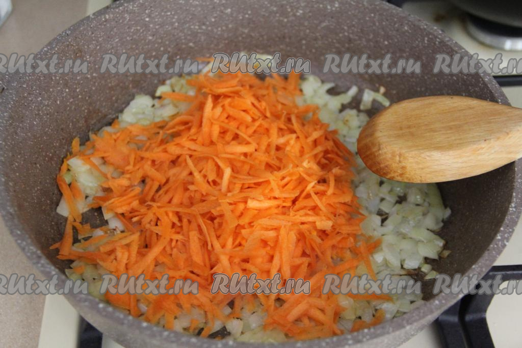 Очистить морковь, натереть на крупной тёрке и переложить в сковороду с обжаренным луком, перемешать. Обжаривать овощи до мягкости морковки (ориентировочно в течение 7-8 минут), периодически помешивая. Овощи подсолить в процессе жарки. Обжаренные овощи убрать с огня, дать им остыть.
