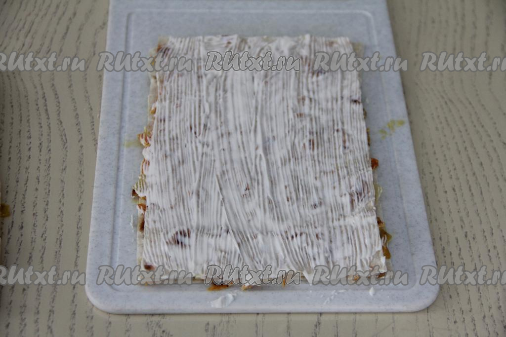Накрыть начинку вторым листом лаваша, смазать ровным слоем майонеза.