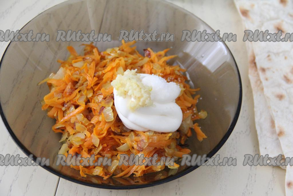 Морковку с луком перемешать с чесноком и майонезом и овощная начинка готова.