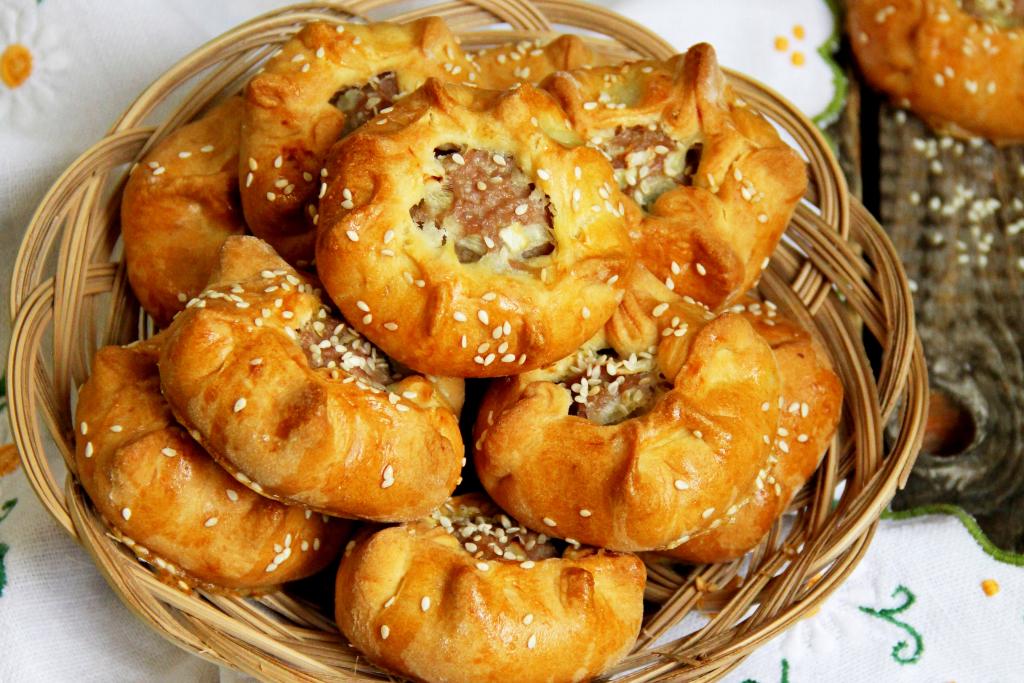 Яйцо взбить в небольшой ёмкости до однородности. Смазать пирожки взбитым яйцом и присыпать кунжутом. Поставить противень с пирожками с мясом в разогретую духовку и выпекать при температуре 180 градусов примерно 40 минут (до золотистости песочного теста).