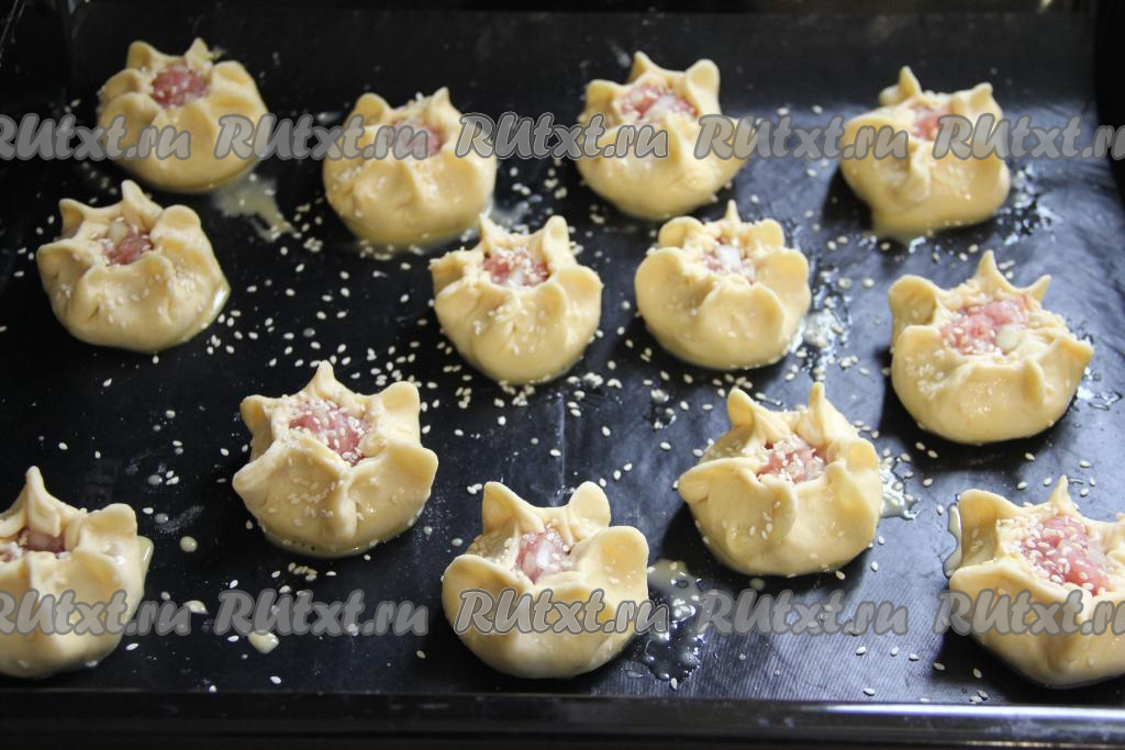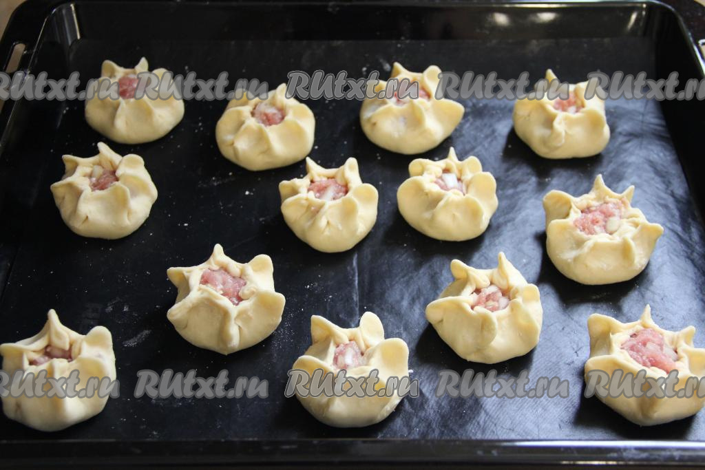 Таким образом сформировать все 13 пирожков из песочного теста с мясом, выложить их на противень, предварительно застеленный ковриком (или пергаментом) для выпечки.