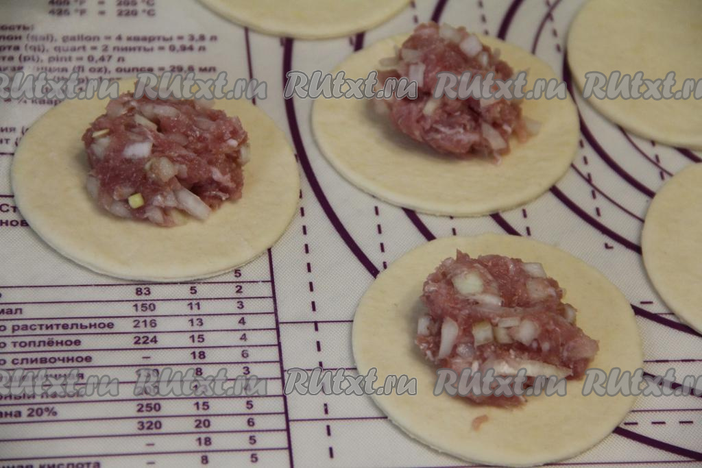 В центр каждого кружочка выложить примерно 1 столовую ложку фарша.
