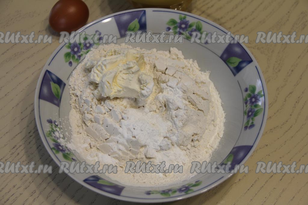 Замесить пластичное, мягкое, не липнущее к рукам песочное тесто. Долго песочное тесто вымешивать руками не нужно, достаточно будет собрать его в ком. Если тесто не будет собираться в ком (многое зависит от величины яйца), влейте постепенно в тесто 1-2 столовых ложки холодной воды, вмешайте и тесто соберётся в ком. Убрать тесто в холодильник на 30 минут.
