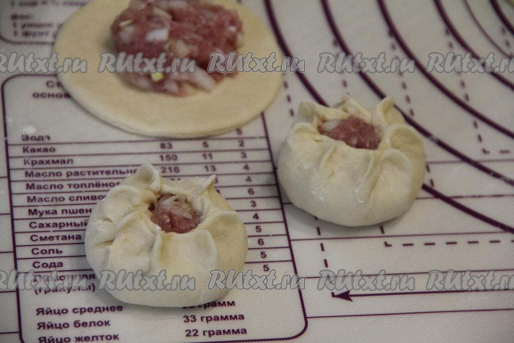 Защипать края теста каждого кружка, оставляя дырочку в центре и формируя пирожок, как на фото.