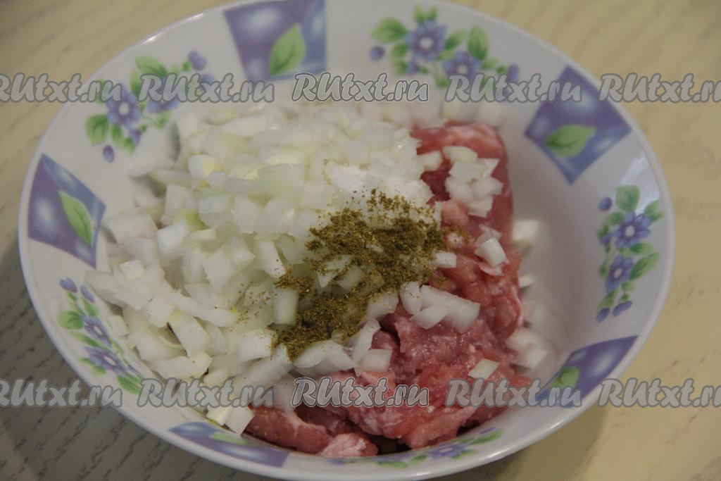 Для того чтобы сделать начинку, нужно в миску выложить фарш, мелко нарезанную луковицу, всыпать соль и специи, хорошо вымесить фарш.