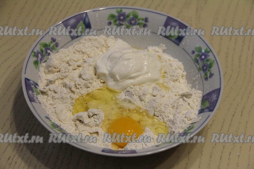 К получившейся песочной крошке добавить сырое яйцо и сметану.
