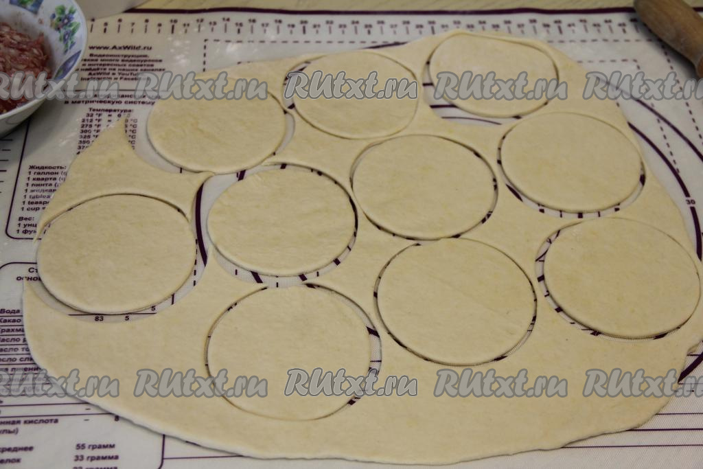 На поверхности, присыпанной мукой, раскатать тесто в пласт толщиной примерно 2-3 миллиметра. Вырезать кружочки диаметром 10 сантиметров. Тесто, оставшееся после вырезания кружочков, снова собрать в ком, раскатать и тоже вырезать кружочки (всего я вырезала 13 кружков).