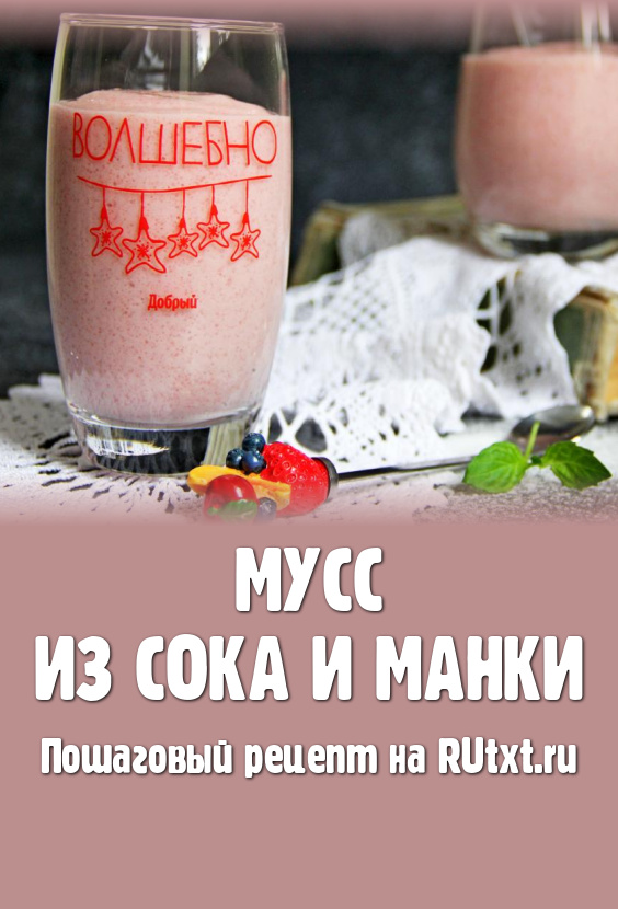Предлагаю приготовить нежный, очень вкусный мусс из сока и манки. Рецепт достаточно простой, нужно лишь проварить сок с манкой, а затем остудить получившуюся смесь и тщательно взбить миксером. Мусс получается очень воздушным, в моей семье даже никто не понял, что в состав входит манка. Для этого десерта можно взять любой фруктовый или ягодный сок. Именно от вкуса и цвета сока будут зависеть вкус и цвет мусса. Если сок достаточно сладкий, тогда сахар можно не добавлять. Подать десерт можно в креманках или фужерах. Приготовьте постный мусс из манки с соком и насладитесь его восхитительно нежным вкусом!