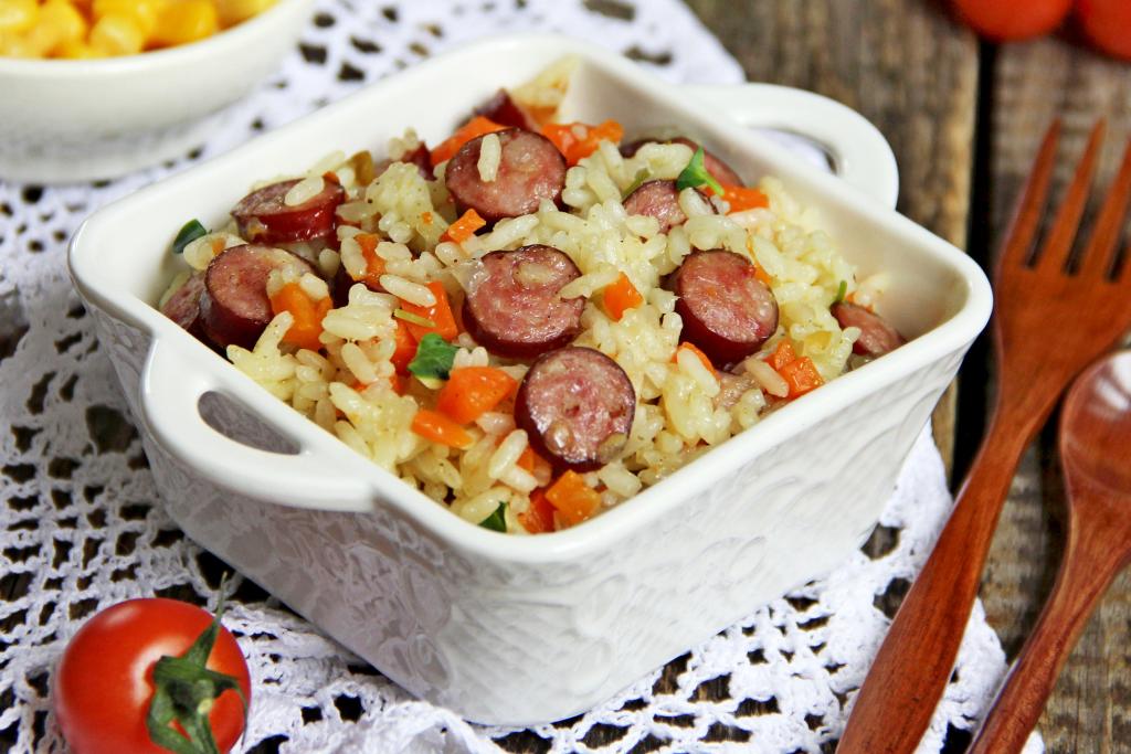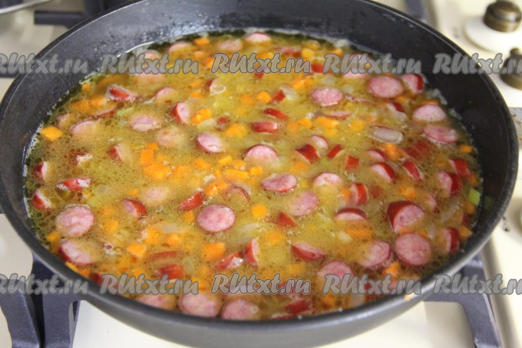 Для приготовления риса с охотничьими колбасками на сковороде потребуется:
