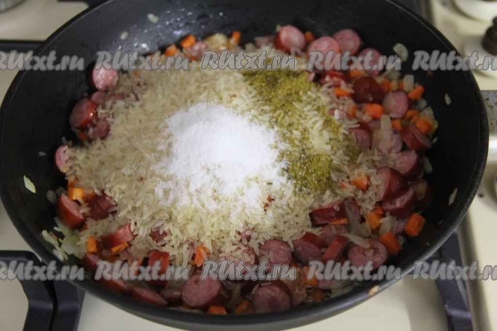 Всыпать рис в сковороду, посолить, приправить специями по вкусу, перемешать.