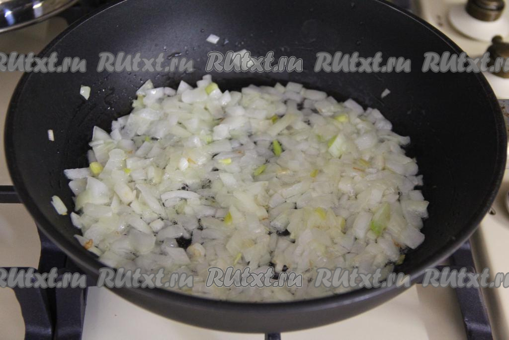 Почистить морковку и лук. Рис промыть водой, дать лишней воде стечь. В сковороде хорошо прогреть растительное масло, выложить мелко нарезанный лук, обжарить его, иногда помешивая, до прозрачности (в течение 5 минут) на среднем огне.