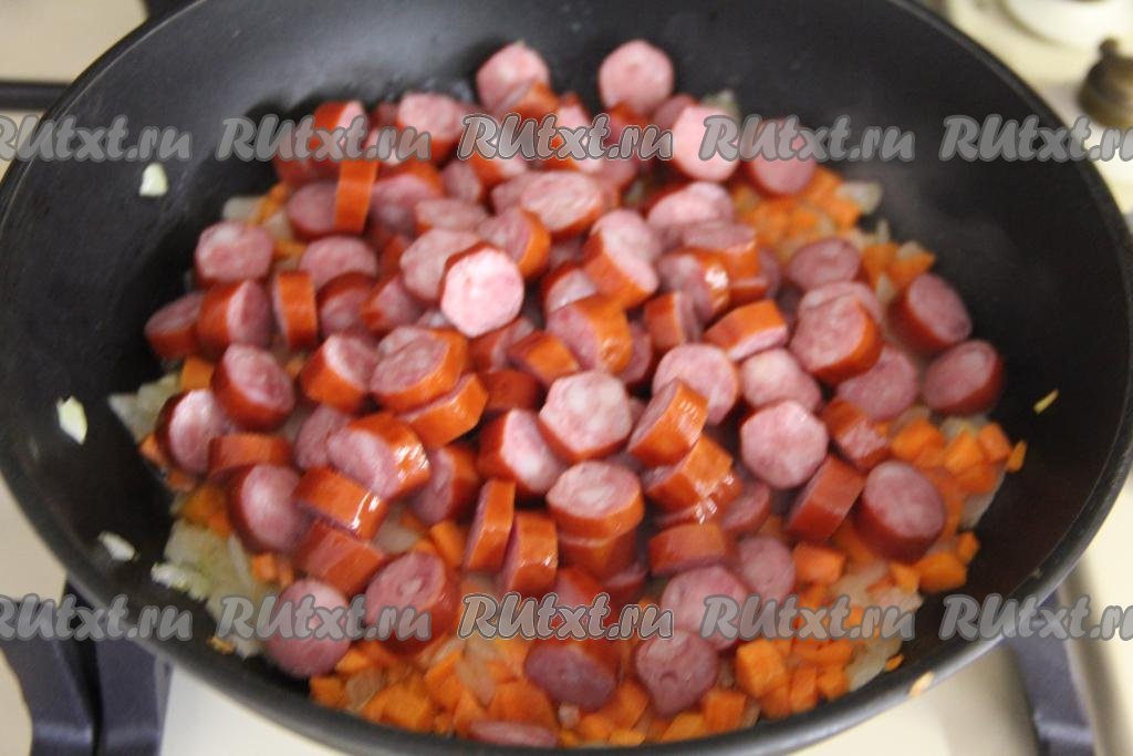Охотничьи колбаски нарезать на кружочки, добавить к обжаренным овощам, перемешать. Обжаривать колбаски с овощами 2-3 минуты, периодически перемешивая.