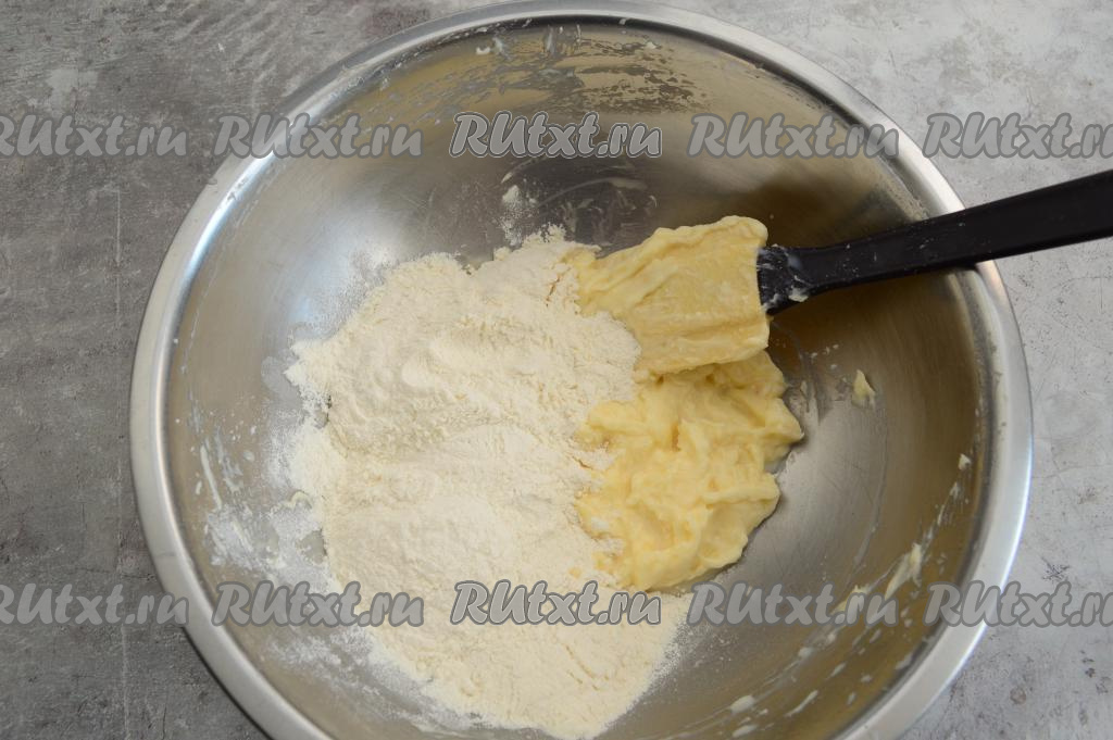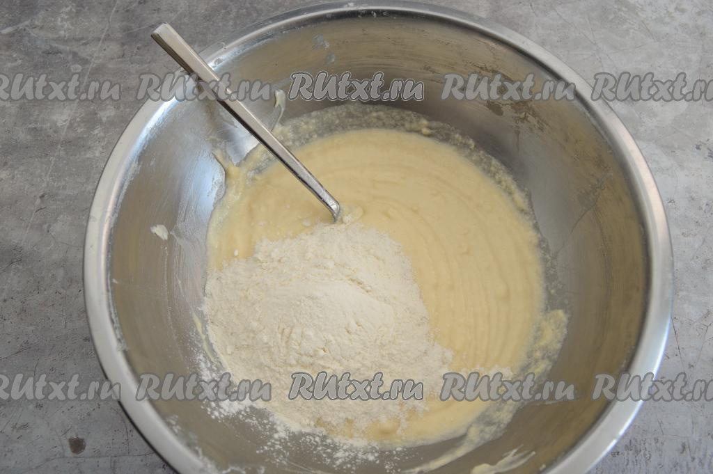 Затем всыпать 90 грамм муки и весь разрыхлитель.