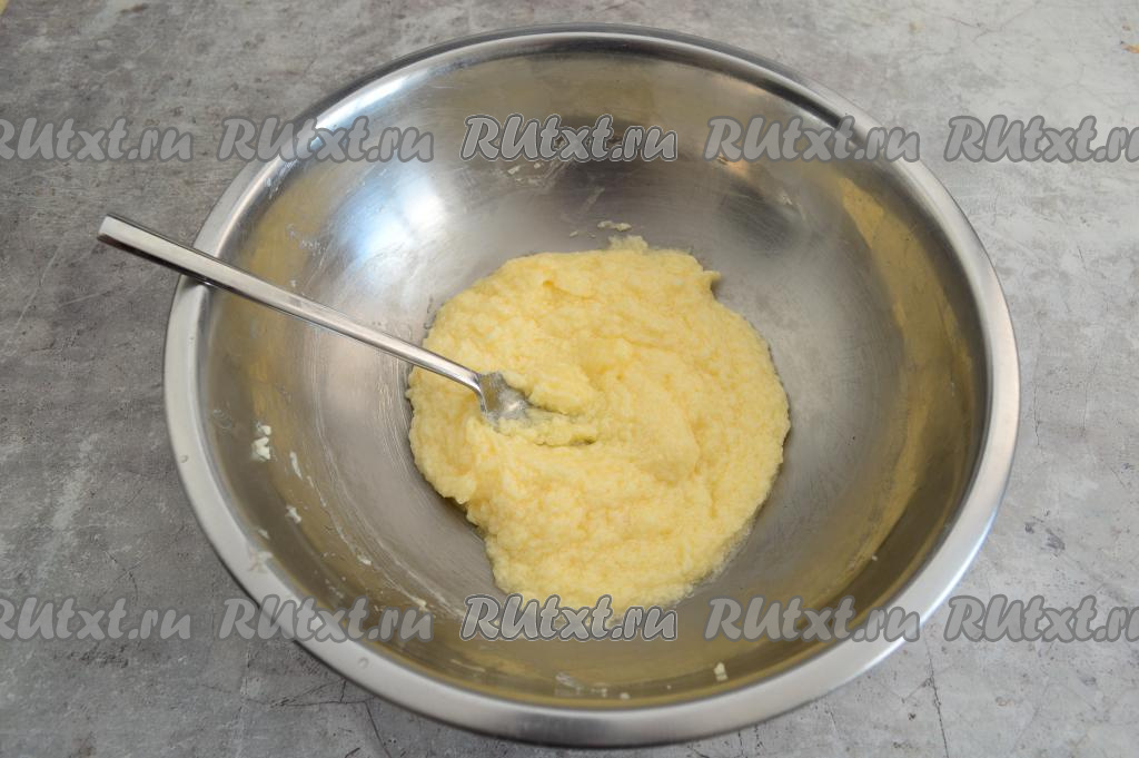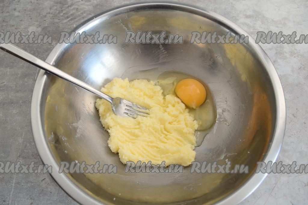 Вилкой смешать сахар и масло до однородности. Вбить в миску сырое яйцо.