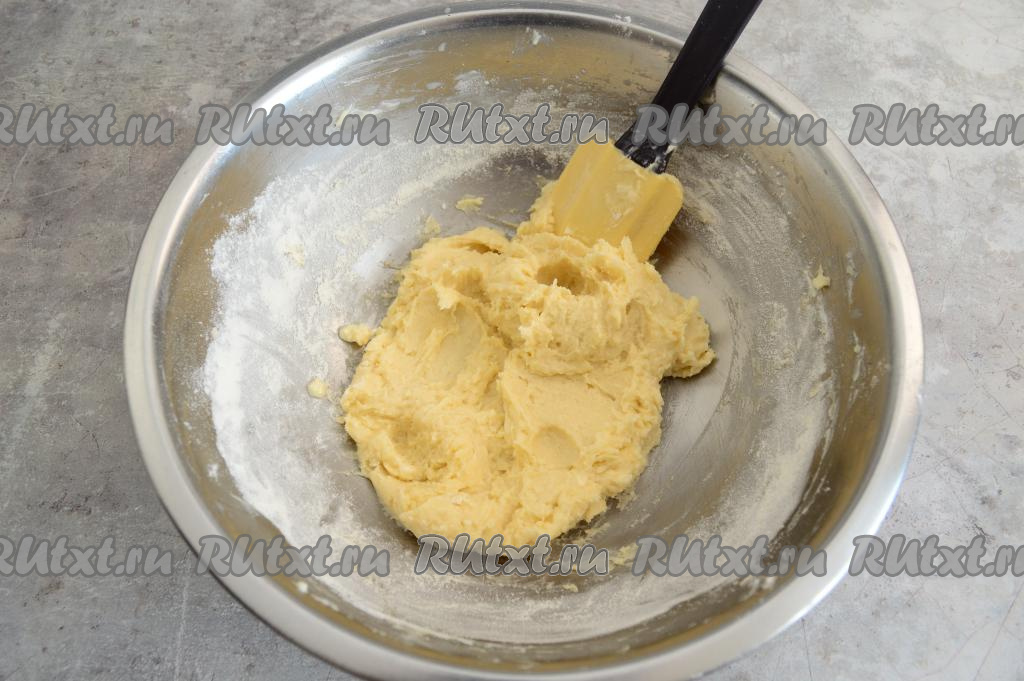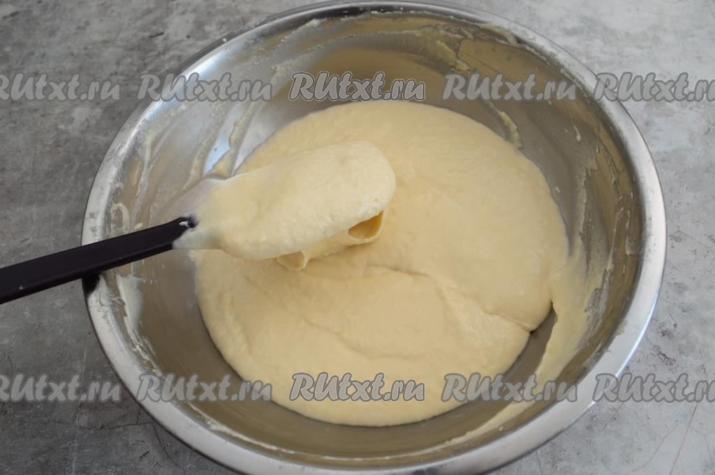 Вмешать муку в тесто при помощи лопатки, тесто будет густым.