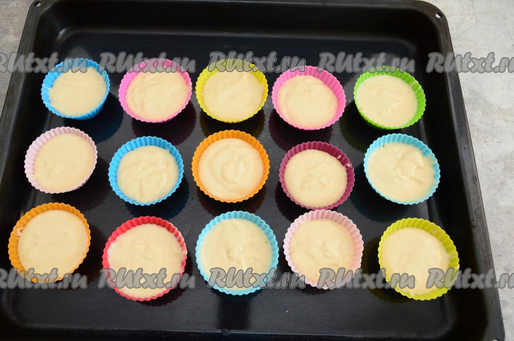 Силиконовые формочки заранее установить на противне. В каждую формочку выложить тесто, заполняя формочки на 3/4 объёма.