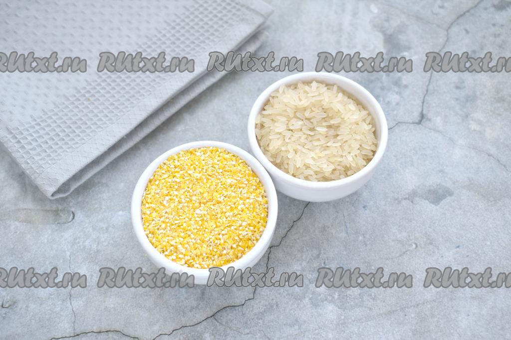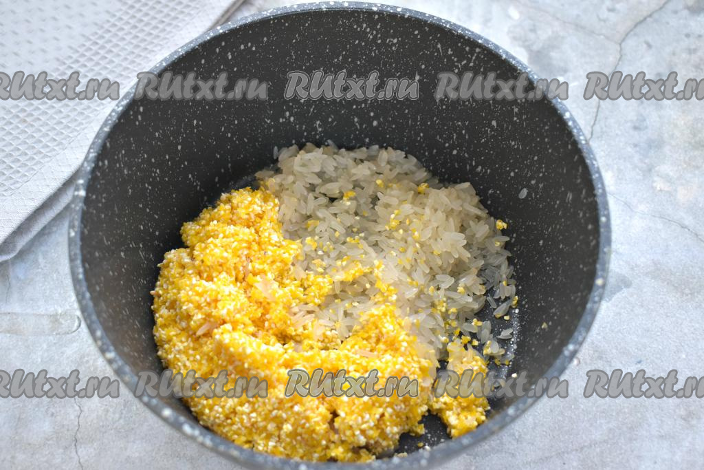 Рис и кукурузную крупу выкладываем в дуршлаг (или сито) и тщательно промываем холодной водой, после этого лишней воде даём стечь. Промытые рис и кукурузную крупу перекладываем в кастрюлю с толстым дном.