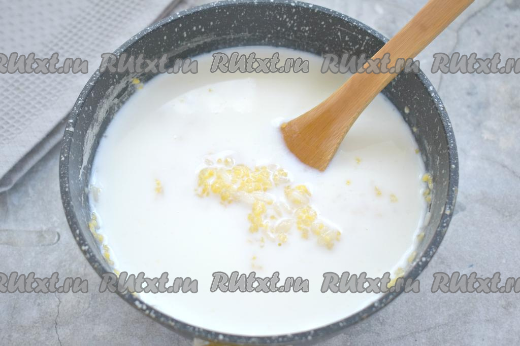 Спустя 15 минут вливаем в кашу молоко (я всегда добавляю заранее прокипячённое молоко), перемешиваем. Даём закипеть и варим рисово-кукурузную кашу на маленьком огне 10 минут, периодически перемешиваем.