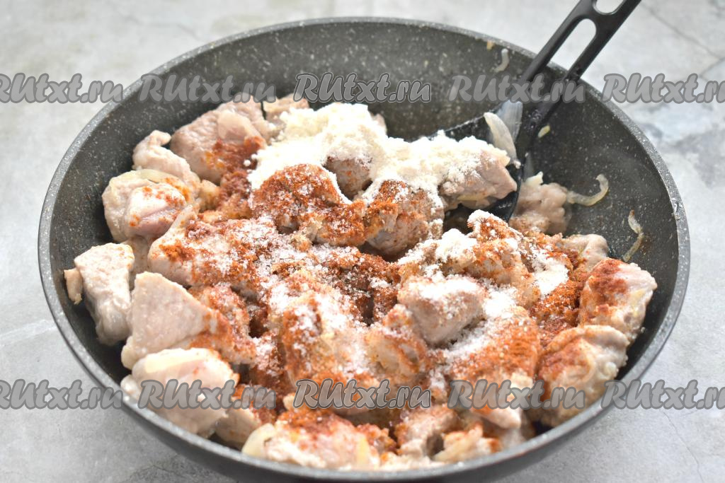 Обжаренное мясо по вкусу солим, перчим, добавляем молотую паприку, сушёный (или мелко нарезанный свежий) чеснок. Именно благодаря паприке гуляш из свинины приобретёт красивый цвет. Всыпаем муку, перемешиваем, продолжаем обжаривать мясо ещё 2 минуты.
