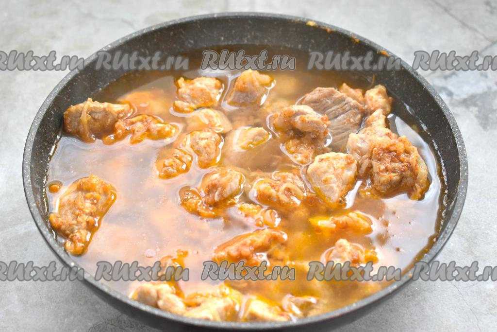Затем вливаем в сковороду со свининой и луком примерно 300 миллилитров воды (мясо должно быть покрыто водой практически полностью), доводим до кипения.
