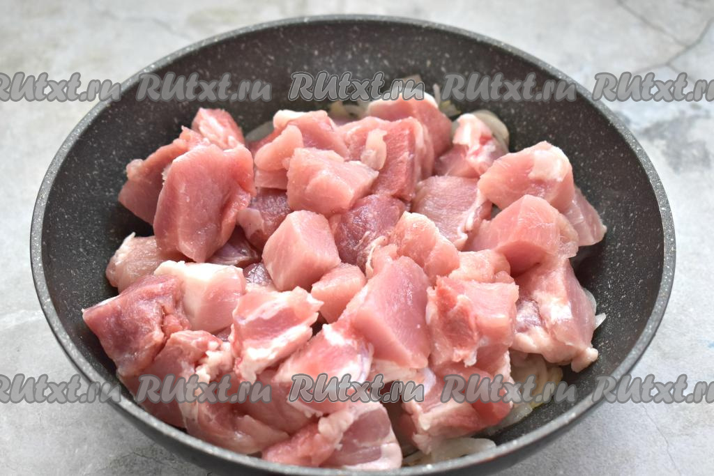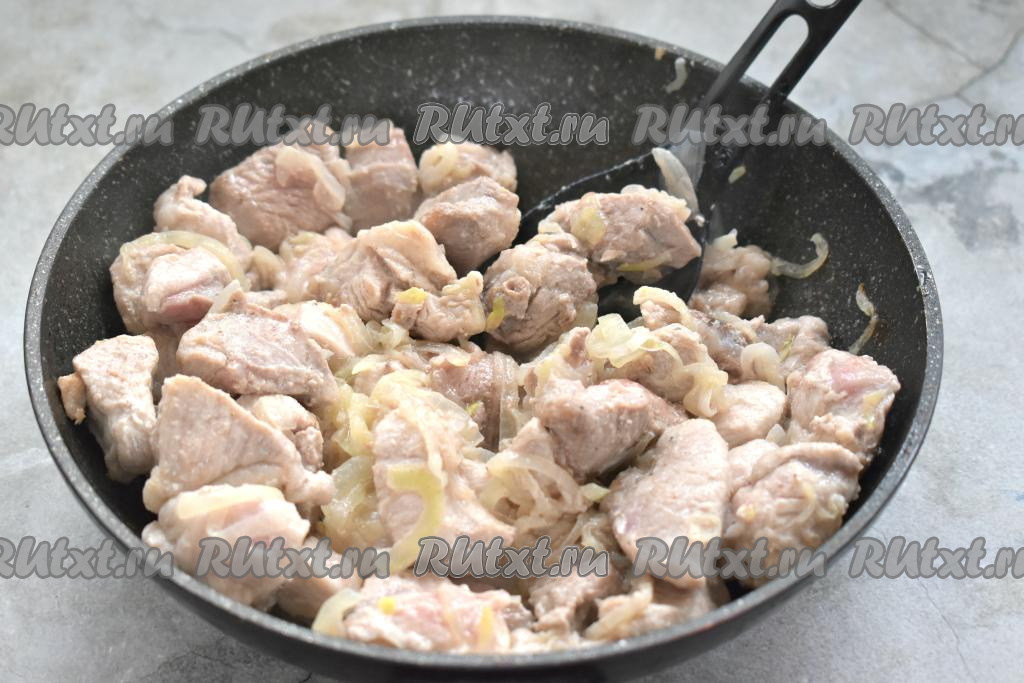 После того как лук станет мягким, добавляем в сковороду кусочки свинины, перемешиваем.