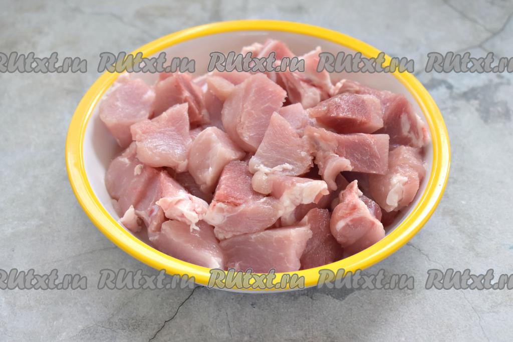 Свинину моем, обсушиваем, нарезаем на небольшие (размером около 2-3 сантиметров) кусочки.