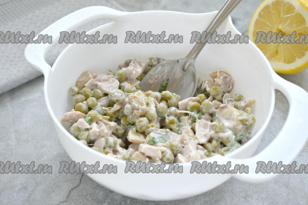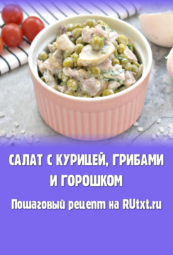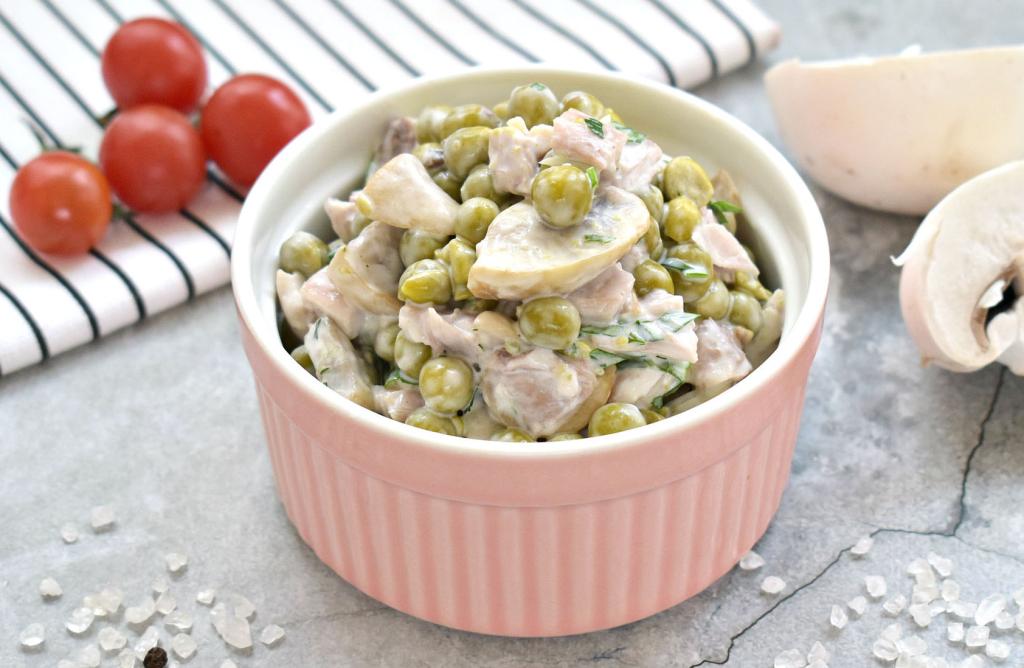 Вкусный, ароматный, насыщенный салат, приготовленный с курицей, грибами и горошком, можно подать не только к повседневному, но и к праздничному столу.
