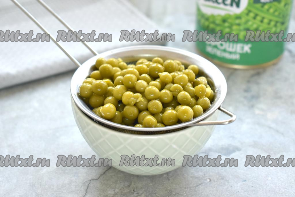 Зелёный консервированный горошек сначала выкладываем на сито, чтобы слить лишнюю жидкость, а затем перекладываем в миску с курицей.