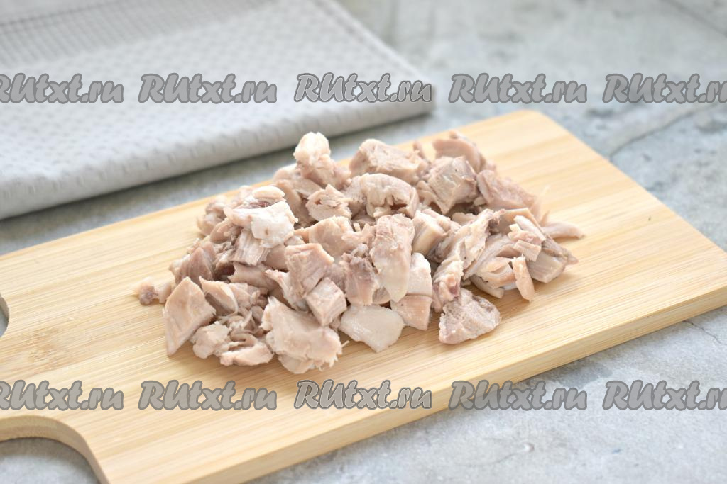 Варёное куриное мясо, отделив от костей (у меня получилось грамм 200 варёного куриного мяса без костей), нарезаем на небольшие кубики, выкладываем их в миску.