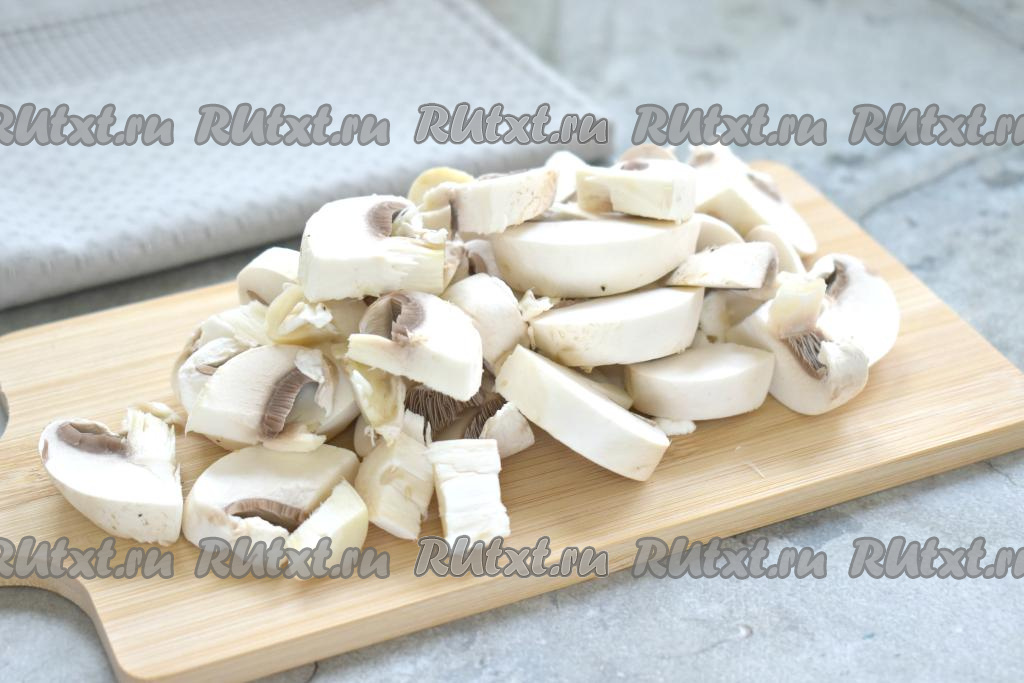 Разогреваем в сотейнике или на сковороде растительное масло, выкладываем нарезанные шампиньоны и обжариваем их 8-10 минут (до готовности и полного испарения жидкости), затем убираем с огня и даём остыть.