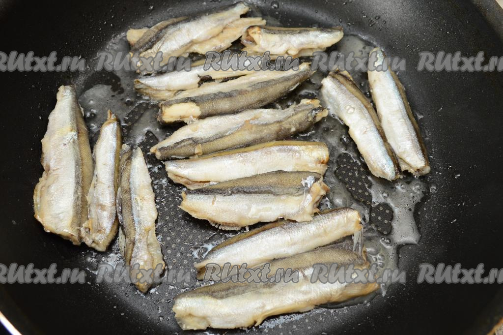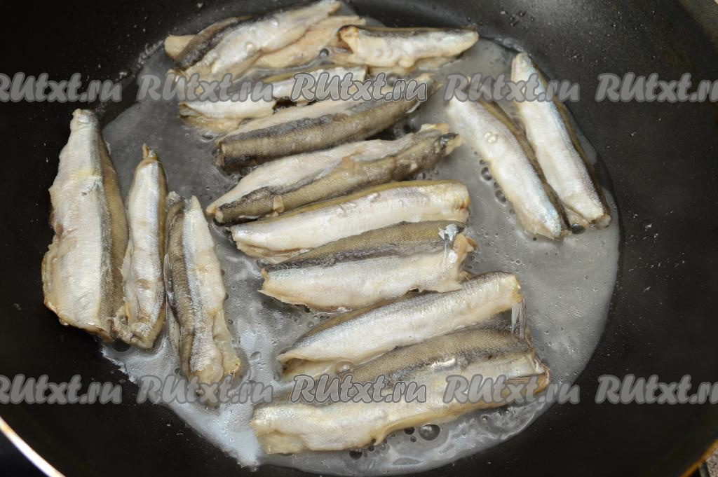 Жарить мойву под крышкой минут 8 (переворачивать в процессе обжаривания рыбу не нужно), в процессе жарки вода испарится.