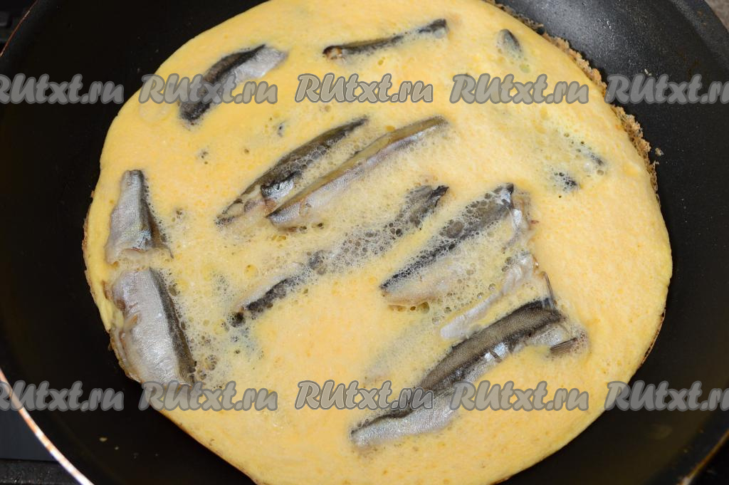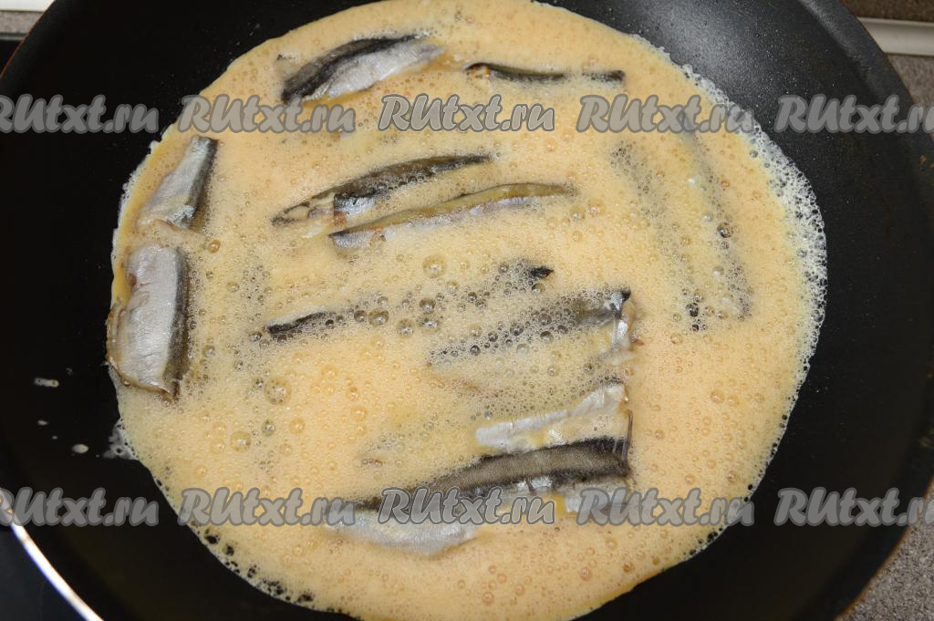 После того как мойва обжарится в течение 8 минут, влить в сковороду яйца.