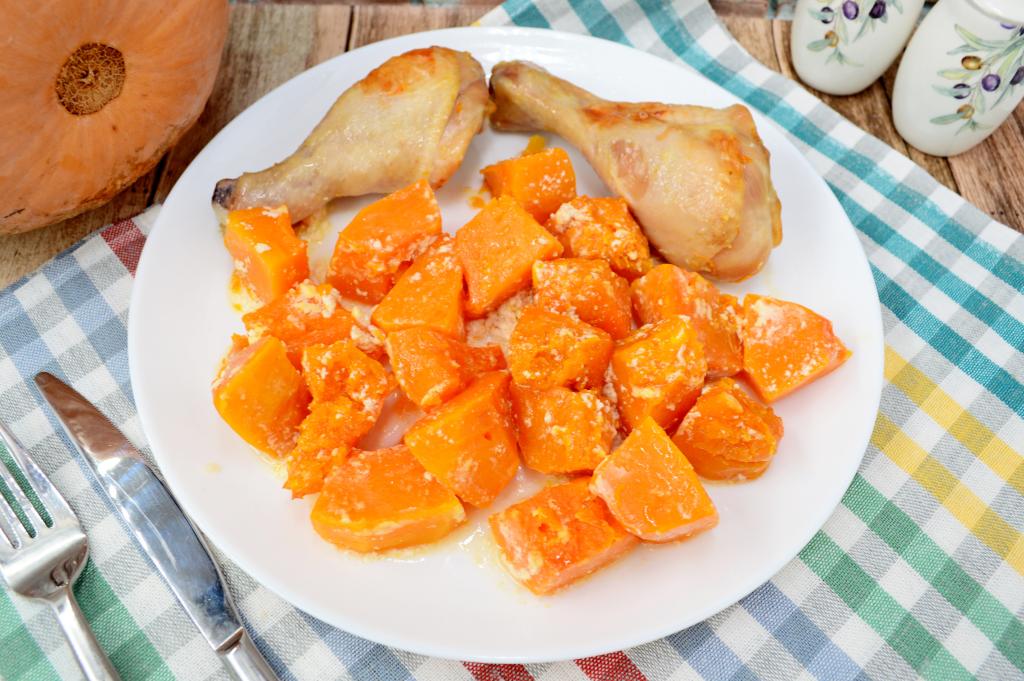 Куриные ножки с тыквой достать из духовки, переложить на плоскую тарелку и подать к столу. Курочка и тыква получаются очень нежными, они просто тают во рту.