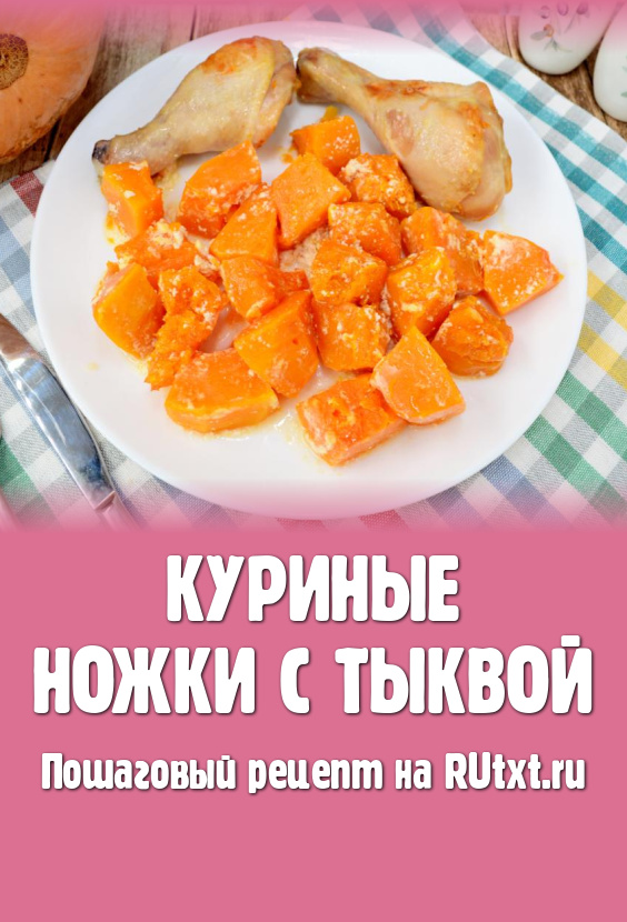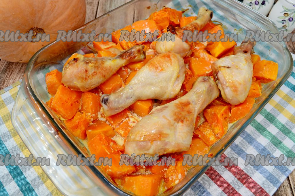 Поверх тыквы выложить куриные ножки. Отправить форму в духовку, разогретую до 200 градусов, на 40 минут. Затем вынуть форму из духовки, перемешать кусочки тыквы, куриные ножки перевернуть на другой бок.