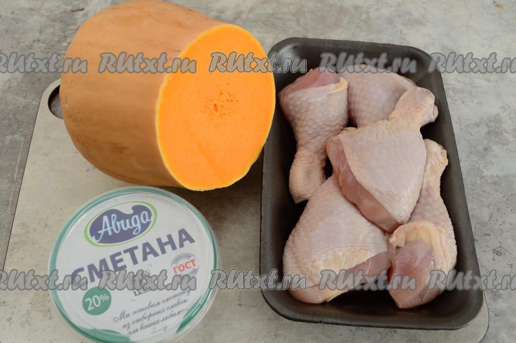 Тыква - замечательный овощ, который отлично подходит для приготовления различных блюд. Недавно решила запечь в духовке куриные ножки вместе с кусочками тыквы. Получилось отличное блюдо. Очень удобно, что готовятся одновременно и мясо, и овощной гарнир. Куриные ножки и тыква перед запеканием смазываются сметаной. Мясо курицы получается сочным и очень аппетитным, кусочки тыквы - мягкими, хорошо пропаренными, но при этом держащими форму. Уверена, это нежное, яркое блюдо многим придётся по вкусу!