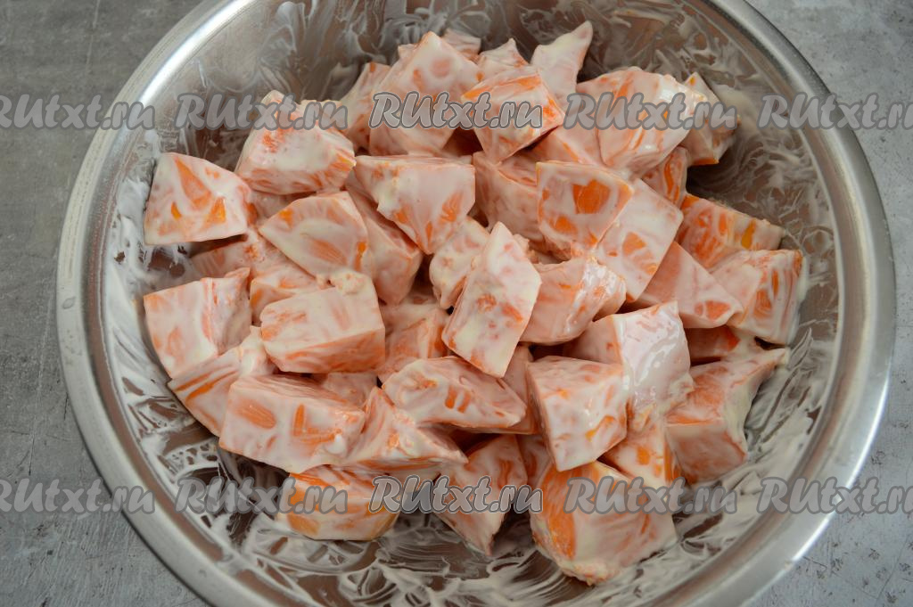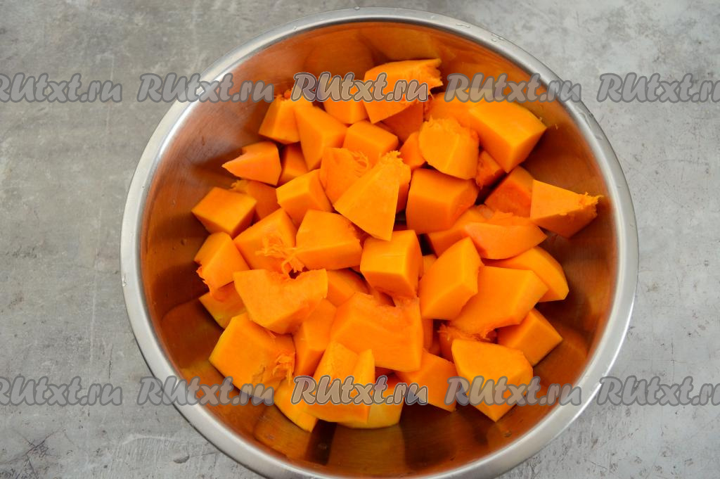Тыкву очистить от кожуры, семечек и волокон. Нарезать очищенную тыкву на средние кусочки (шириной примерно 3-4 сантиметра), сложить в миску.