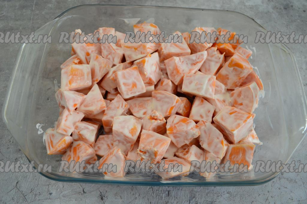 Выложить тыкву в сметане в форму для запекания. Я форму предварительно маслом не смазывала, так как во время запекания выделяется достаточное количество жидкости и тыква не пристаёт к форме.
