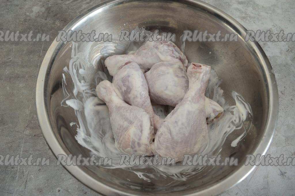 Куриные ножки вымыть, обсушить, переложить в миску, посолить по вкусу. К ножкам добавить 1-2 столовых ложки сметаны, перемешать.