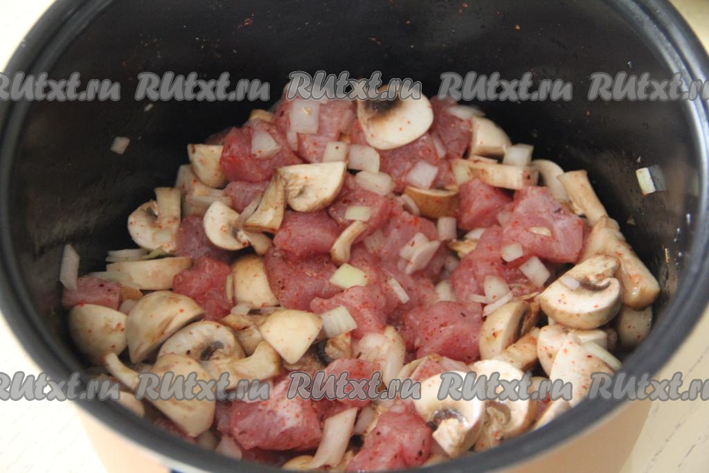 В чашу мультиварки выложить кусочки свинины, нарезанные лук и шампиньоны (или отваренные и разрезанные на части лесные грибы).