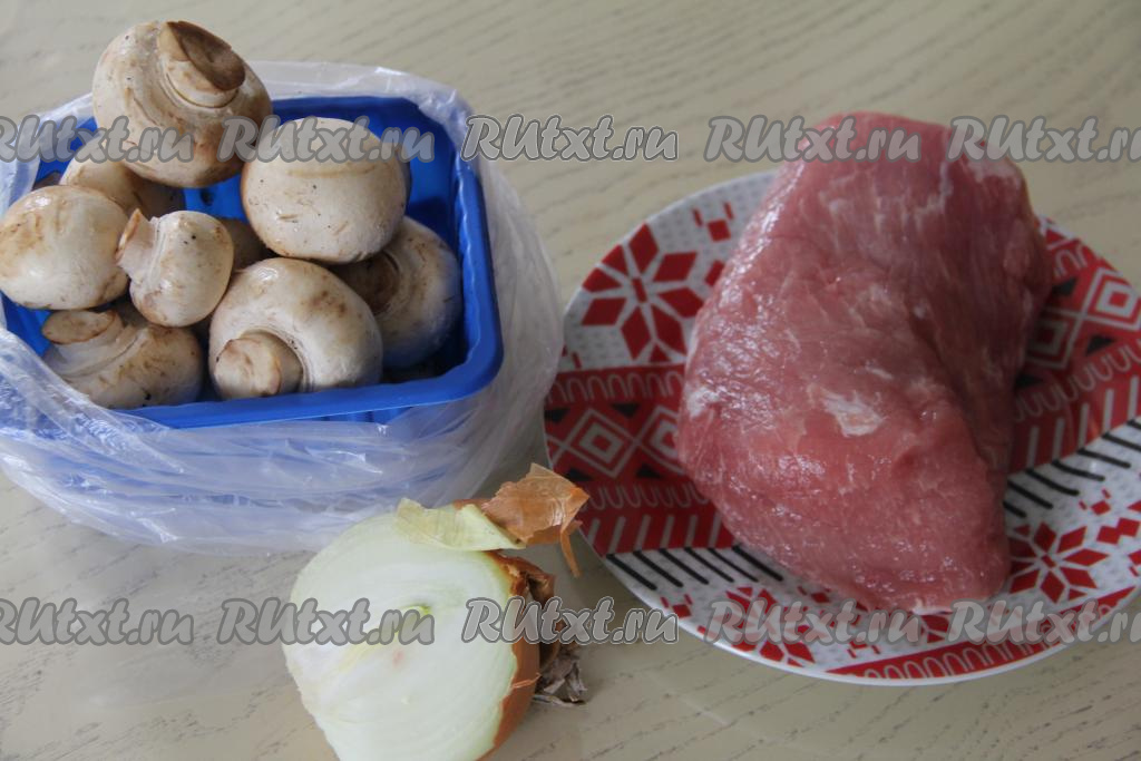 Подготовить продукты. Шампиньоны промыть водой, убирая с них все загрязнения. Если будете готовить с лесными грибами, их нужно перебрать, почистить, отварить в течение 25-30 минут с момента закипания воды. Лук очистить. Мякоть свинины промыть и обсушить.