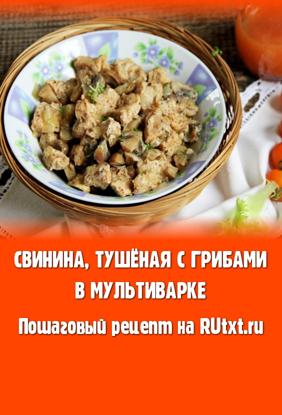 Перемешать свинину с шампиньонами (или лесными грибами). Установить чашу в мультиварку, закрыть крышку и выставить режим "Тушение" на 1 час. Несколько раз за это время мясо с грибами можно перемешать.