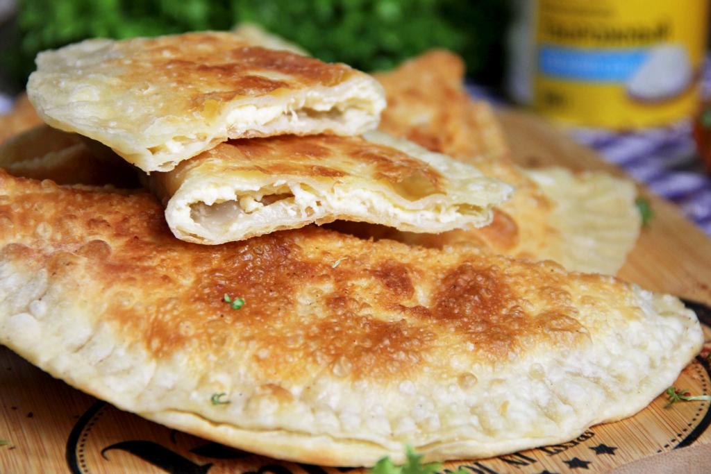 Готовые чебуреки выкладывать со сковороды на бумажное полотенце, чтобы удалить излишки масла. Постепенно пожарить все чебуреки. Аппетитные, вкусные чебуреки с нежной начинкой из творога и сыра горячими подать к столу.