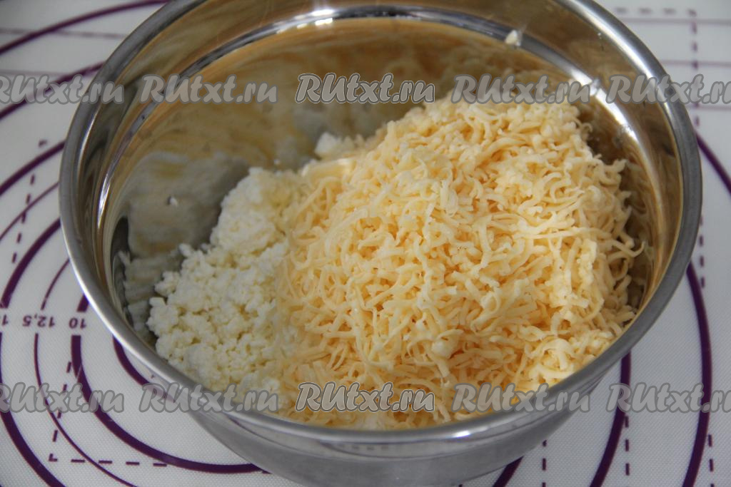 Для получения начинки для чебуреков нужно в отдельной миске соединить творог и натёртый на мелкой терке сыр, перемешать. Начинка готова.