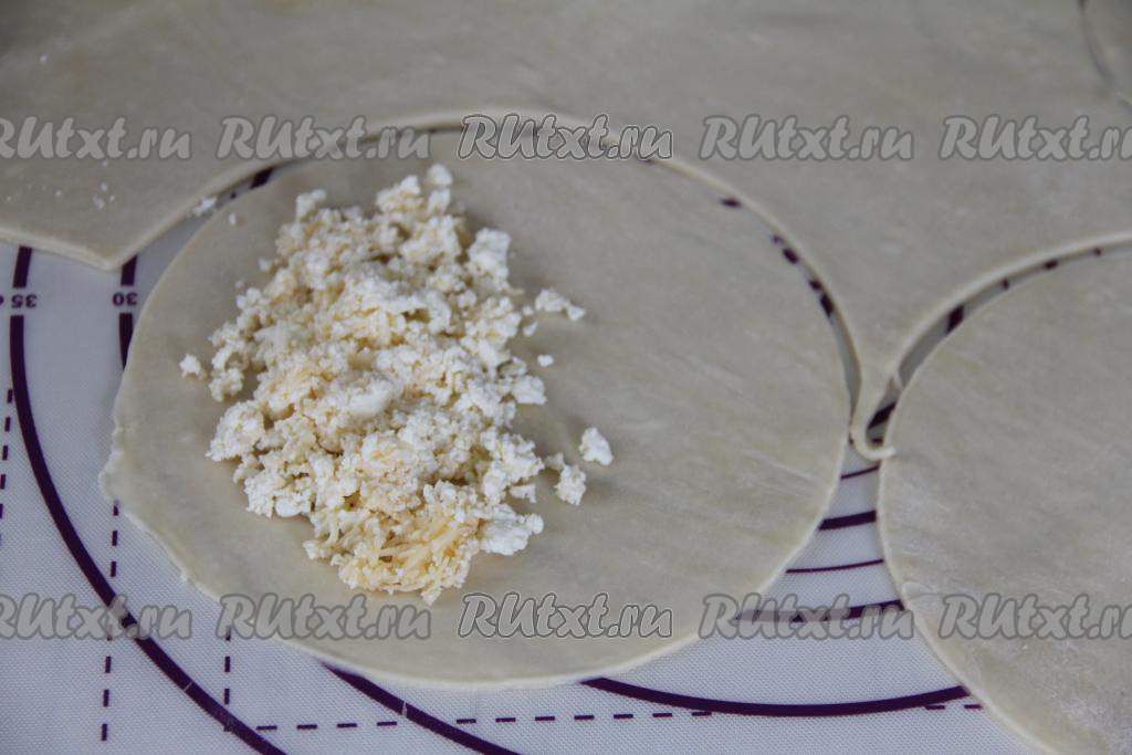 Начинку разделить на равные части (по количеству раскатанных кругов). Я разделила творожно-сырную начинку на 8 частей. На одну половину кружка из теста, отступив от края круга, выложить одну часть начинки (я выкладывала примерно 2 столовых ложки начинки).